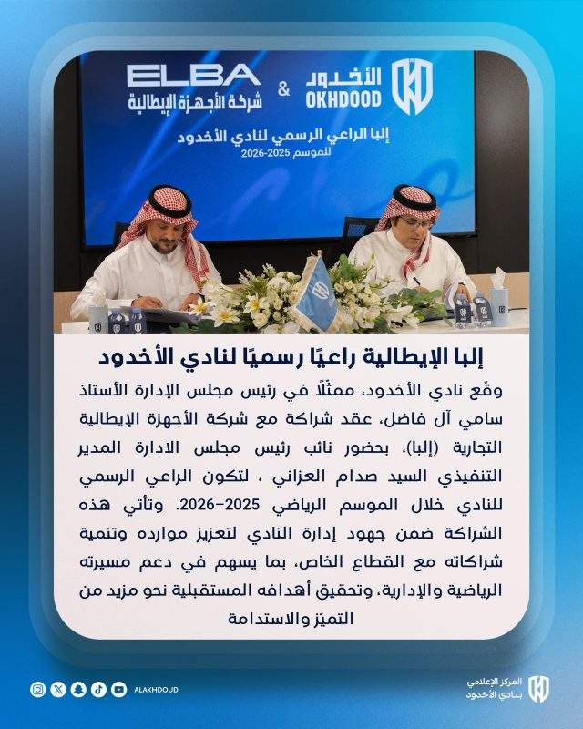 19 نوفمبر الاخبار الرياضية إلبا الإيطالية راعيًا رسميًا لنادي الأخدود Posted by نادي الأخدود الرياضي 19 نوفمبر، 2025