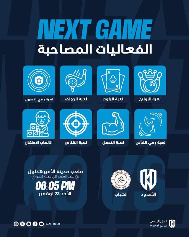 20 نوفمبر التفاعل مع الجمهور و المسابقات الفعاليات المصاحبة لمباراة الاخدود والشباب Posted by نادي الأخدود الرياضي 20 نوفمبر، 2025
