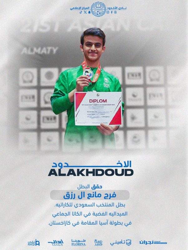ألف مبروك للبطل “فرج آل رزق” بطل الاخدود وبطل المنتخب السعودي للكاراتيه تحقيقه الميدالية الفضية في الكاتا الجماعي في بطولة آسيا المقامه في كازاخستان.