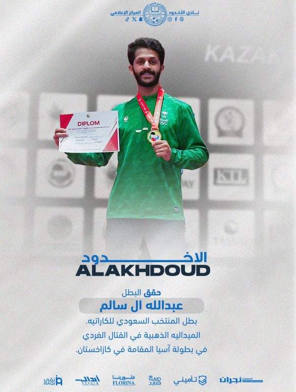 ألف مبروك للبطل “عبدالله آل سالم” بطل الاخدود وبطل المنتخب السعودي للكاراتيه تحقيقه الميداليه الذهبية في القتال الفردي في بطولة آسيا المقامه في كازاخستان.