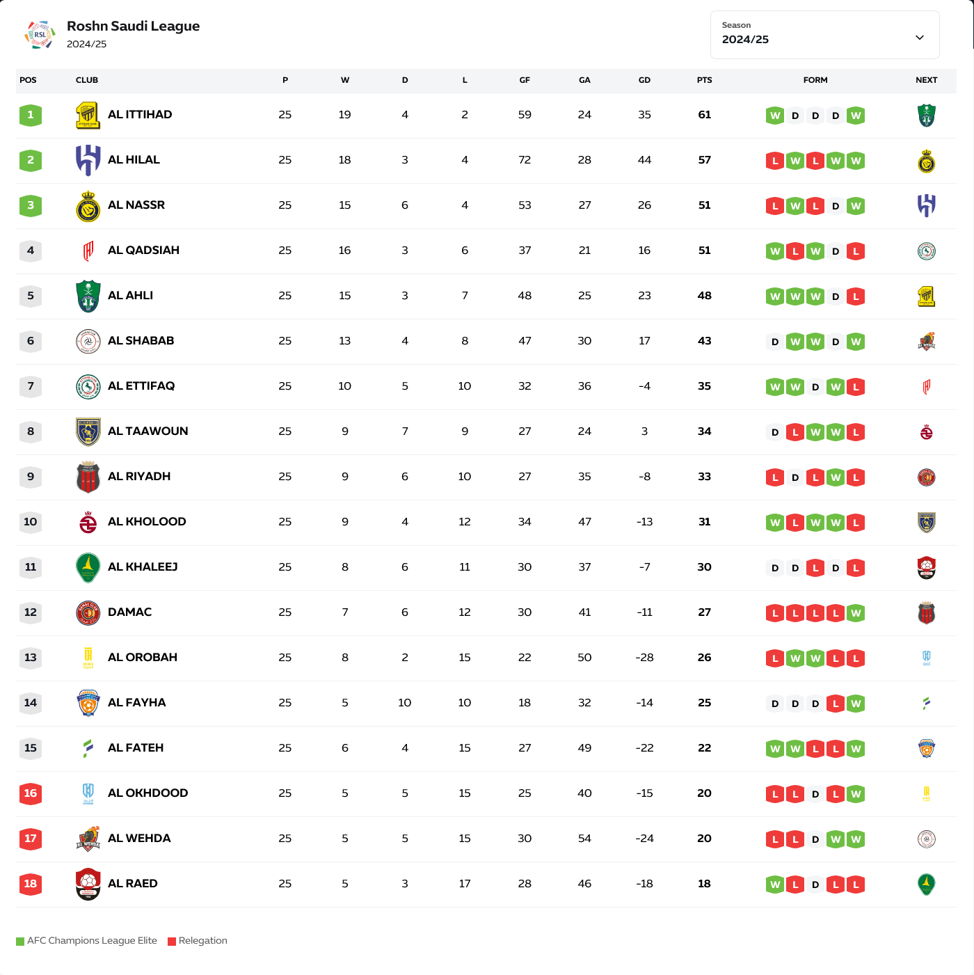 HomeROSHN Saudi LeagueROSHN 2024-2025Live Table & Standings